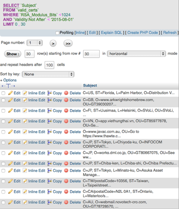 From the list above, I looked for certificates that were generated using the old Debian PRNG bug. The problem was that this happened in 2008 and the SSL database that we have is from 2010, so most interesting websites changed their certificates before 2010.
